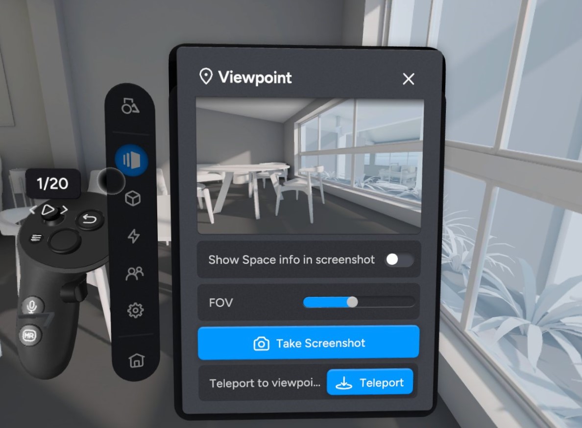 Open the Scenes menu, go to the Viewpoints tab, and click on the viewpoint with the trigger button to open the viewpoint preview. It allows you to see what your screenshot will look like. You can adjust the viewpoint or objects and see the changes in real time in the preview.&#x20;
